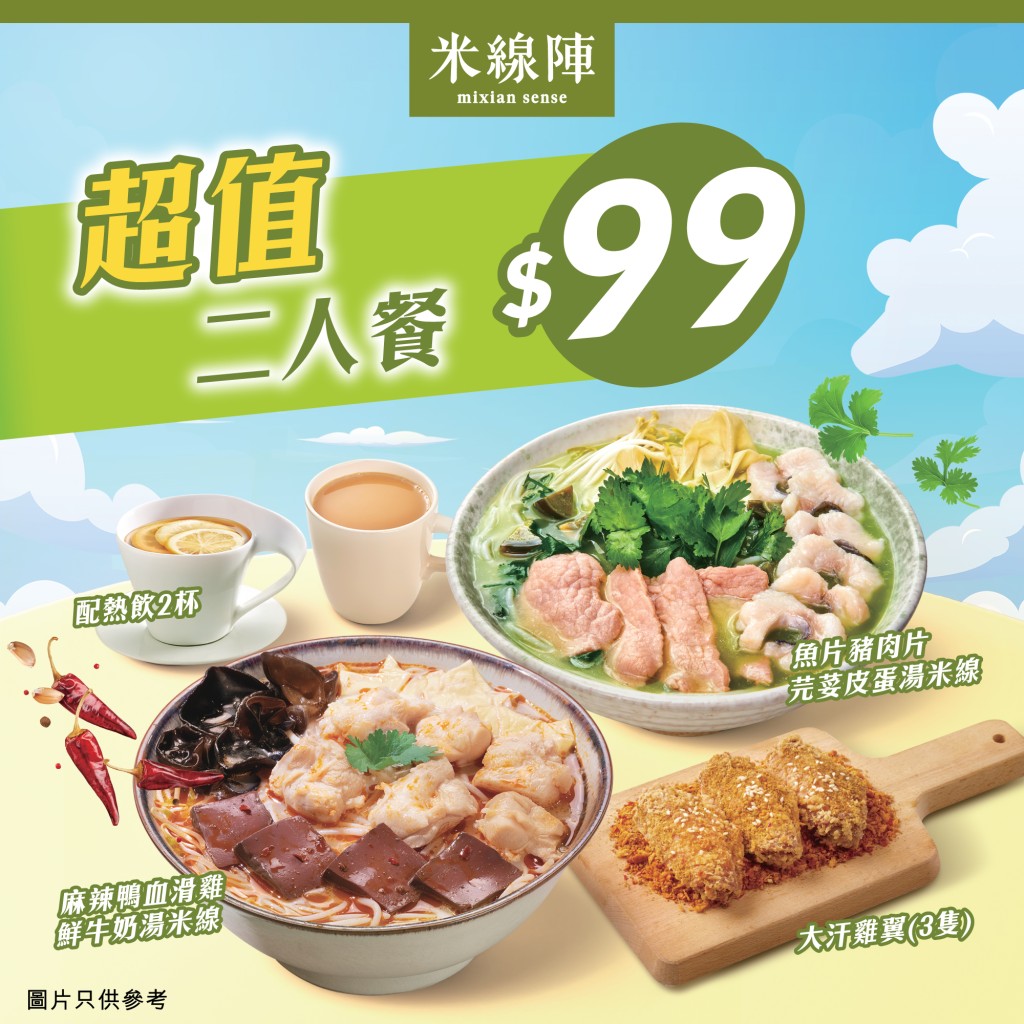 除了買(mǎi)一送一優(yōu)惠外,米線陣亦有推出抵食二人餐優(yōu)惠。于晚上6時(shí)到米線陣門(mén)店(九龍站分店除外)點(diǎn)選堂食及外賣(mài)自取,以$99購(gòu)買(mǎi)“超值二人餐”,套餐餐包括麻辣鴨血滑雞鮮牛奶湯米線及魚(yú)片豬肉片芫荽皮蛋湯米線各一客、大汗雞翼3只及熱飲2杯。