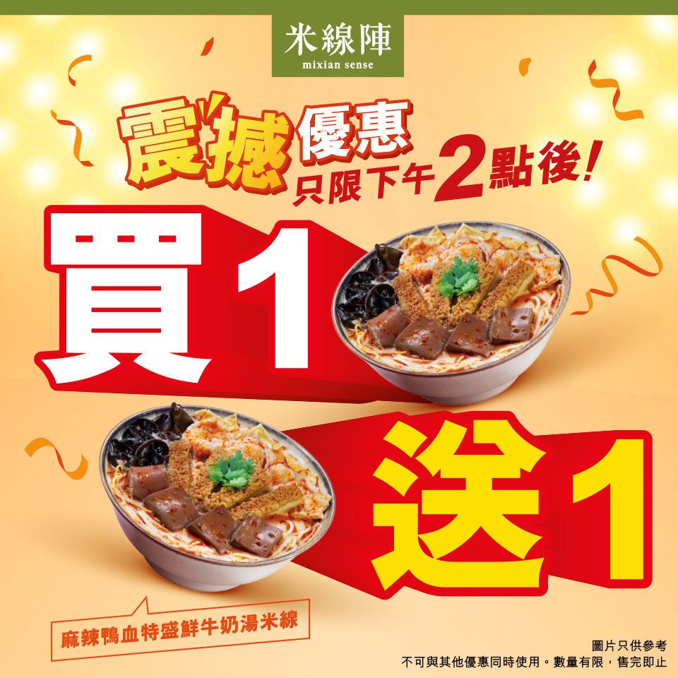 即日起至10月11日,顧客凡于下午2時(shí)后到米線陣任何一間分店,即可享“麻辣鴨血特盛鮮牛奶湯米線”買(mǎi)一送一優(yōu)惠,$58就可以嘆到兩碗特色米線,平均每碗亦只需$29,麻辣湯底結(jié)合柔滑的鮮牛奶,再搭配鴨血、云耳等豐富食材,形成獨(dú)特的口感,讓人一試難忘!優(yōu)惠適用堂食、外賣(mài)或者外賣(mài)自取網(wǎng)上點(diǎn)餐,不妨約上親友一同品嚐這份獨(dú)特的滋味。