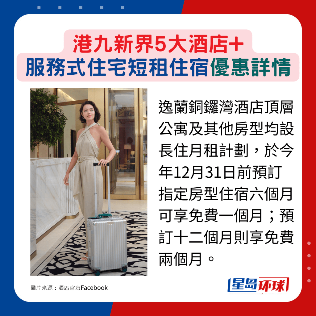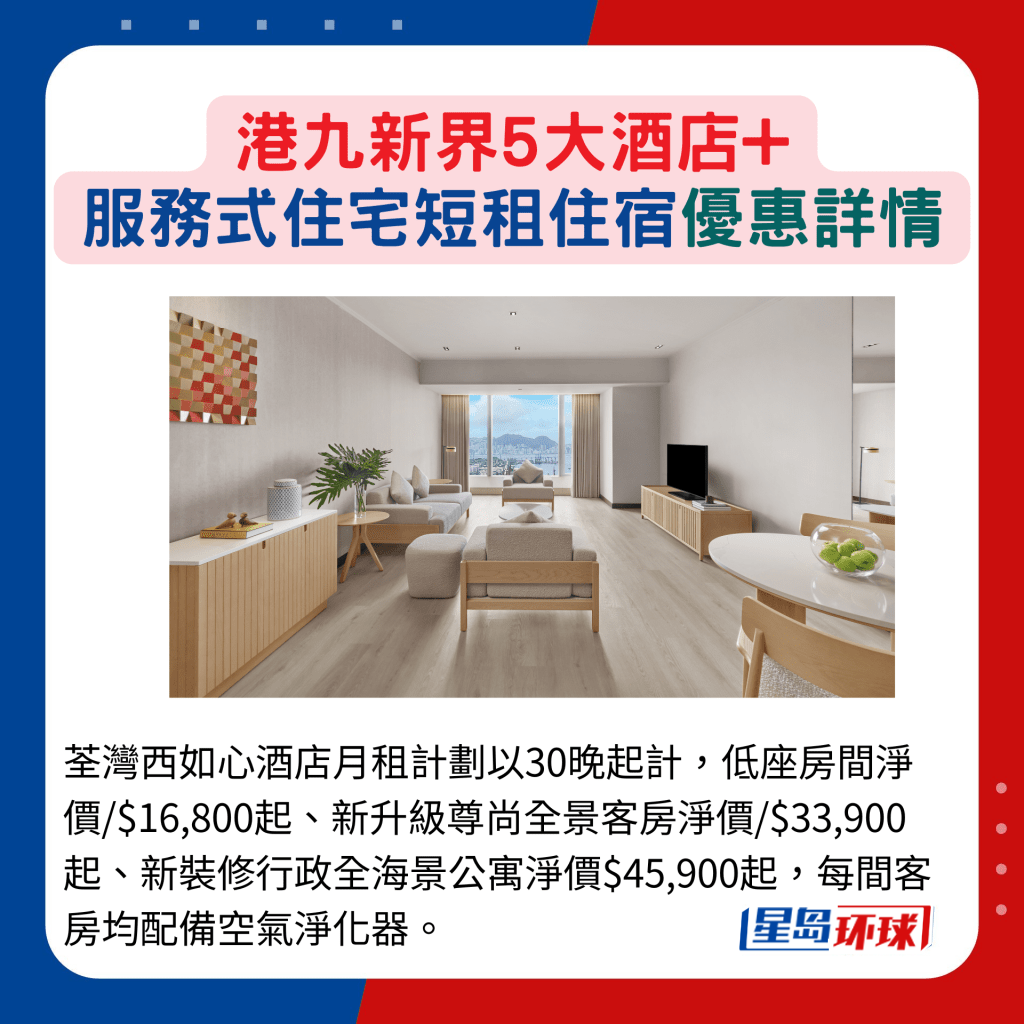 不論是家居裝修還是到港商旅,需要至少連續(xù)數(shù)周或以上的短租住宿,酒店及服務(wù)式住宅都是熱選。除了地點(diǎn)及交通是 優(yōu)先考慮,追求優(yōu)質(zhì)起居生活的話,設(shè)施、餐飲,甚或?qū)櫸镉焉品?wù)等同樣重要,香港不同地區(qū)都可找到提供免費(fèi)早餐、健身課堂、購(gòu)物著數(shù),以至連續(xù)住宿折扣等優(yōu)惠的酒店。今日就為大家推介5間分別位于港、九及新界的高性價(jià)比優(yōu)質(zhì)選擇。