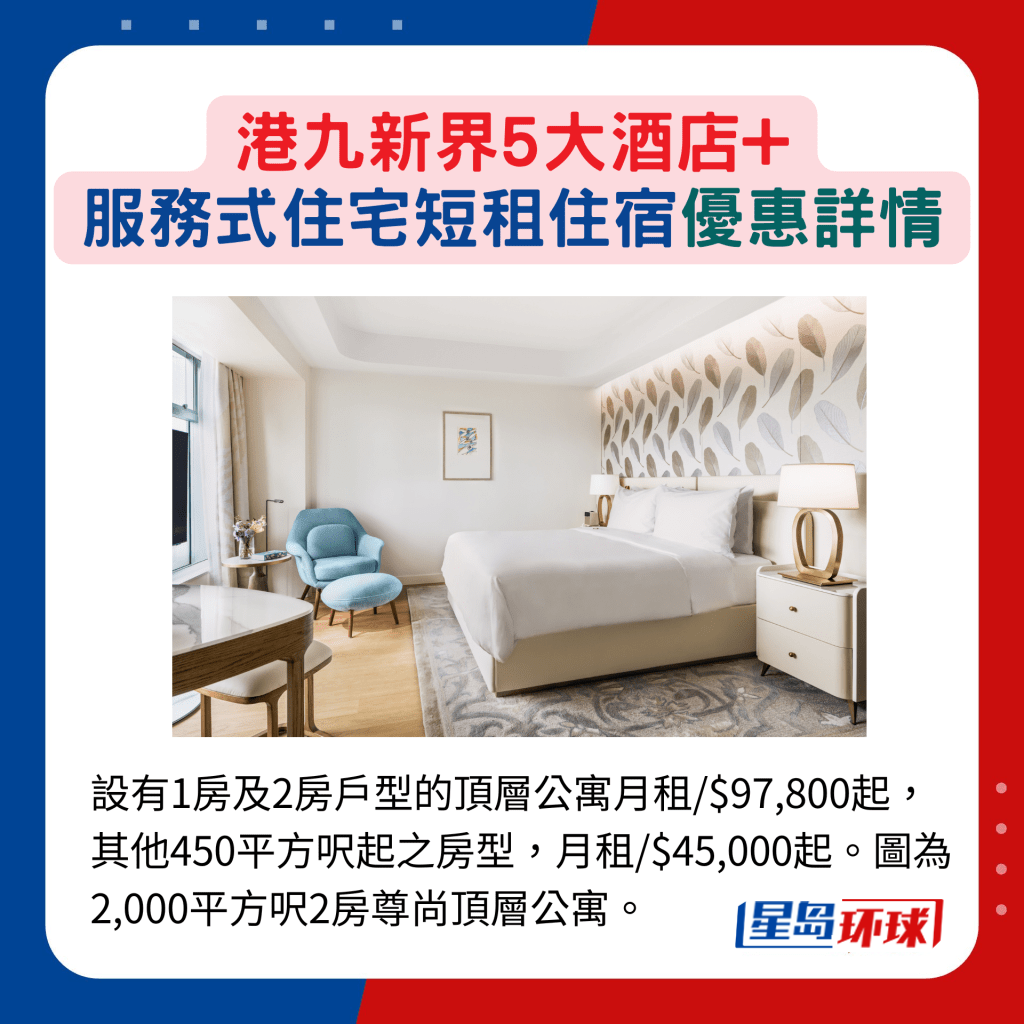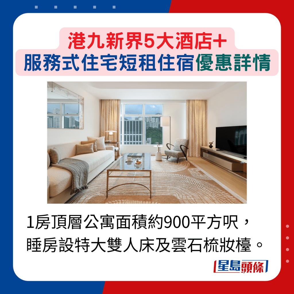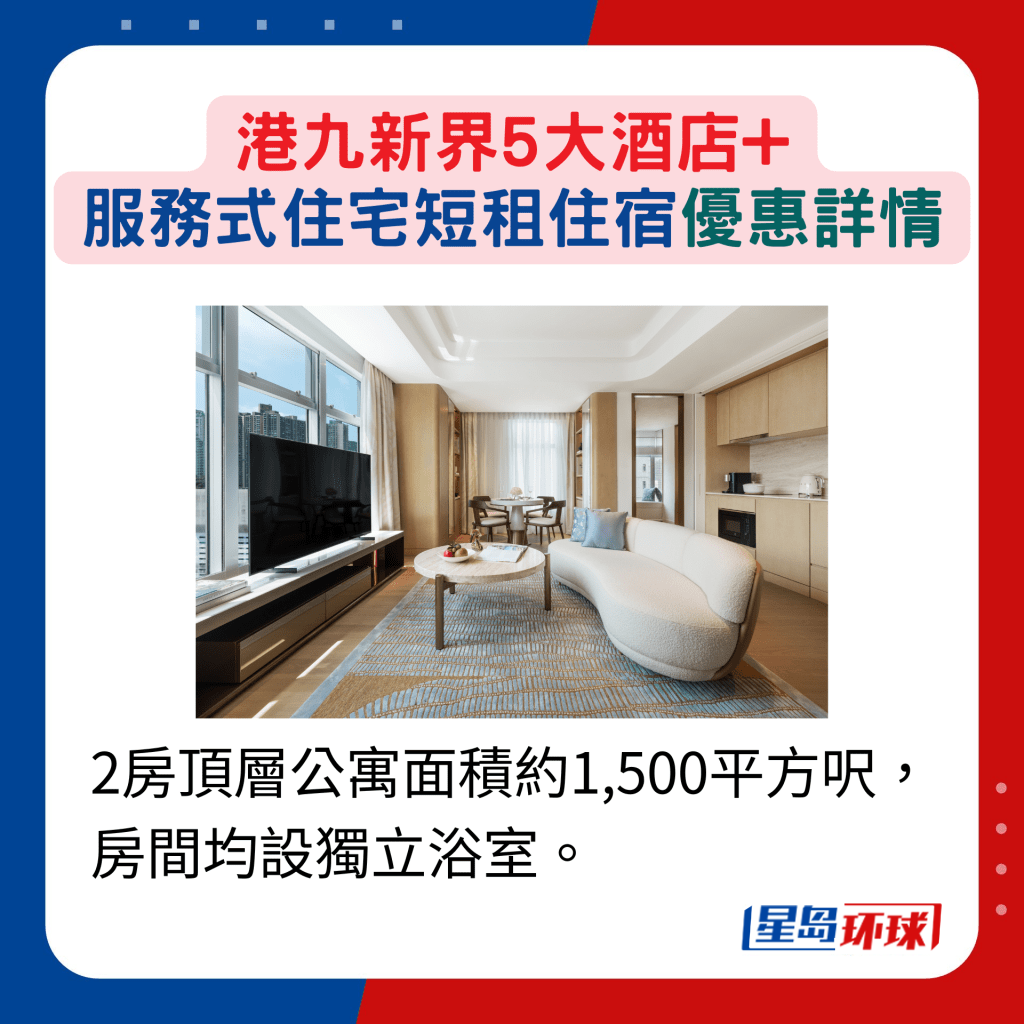 位于尖東的富豪九龍酒店亦有提供連續(xù)入住7晚、14晚及30晚的短租選擇,若挑選豪華客房或以上房型,均可免費(fèi)獲每日"Grab & Go"咖啡或茶及2塊糕點(diǎn),以及體驗(yàn)健康活動(dòng)等。若入住家庭客房(高級(jí)豪華客房)或以上房型連續(xù)兩個(gè)月享9折,連續(xù)三個(gè)月則享85折,換言之,住宿時(shí)間越長(zhǎng)越抵住! 同樣位于尖沙咀的服務(wù)式住宅港威豪庭,提供712平方呎的開放式單位,以至2,931平方呎的3房頂層特色單位,每個(gè)單位均由指定房務(wù)員管理,確保私隱度,亦提供每日打掃服務(wù) (星期日及公眾假期除外)。住客更可享海港城city'super專屬優(yōu)惠,最適合愛購(gòu)物一族。