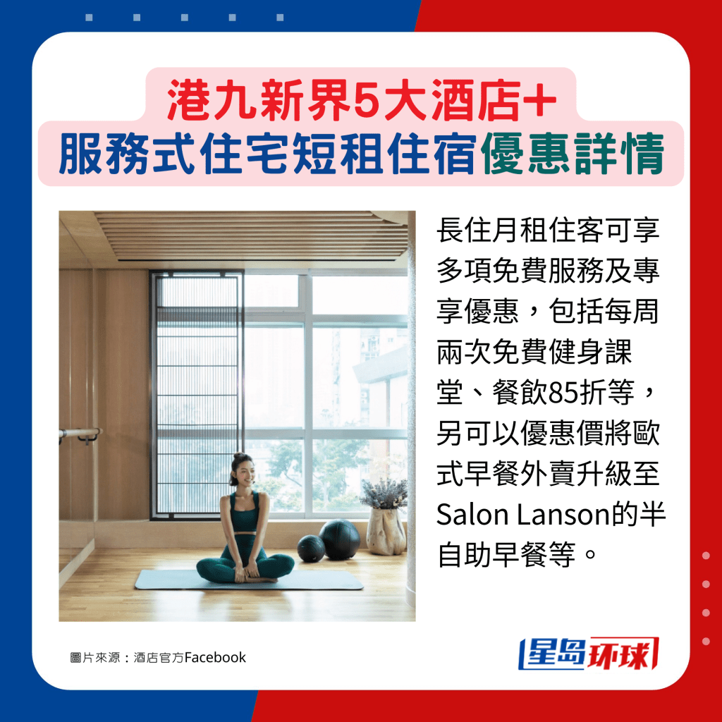 長(zhǎng)住月租住客可享多項(xiàng)免費(fèi)服務(wù)及專享優(yōu)惠,包括每周兩次免費(fèi)健身課堂、餐飲85折等,另可以優(yōu)惠價(jià)將歐式早餐外賣升級(jí)至Salon Lanson的半自助早餐等。