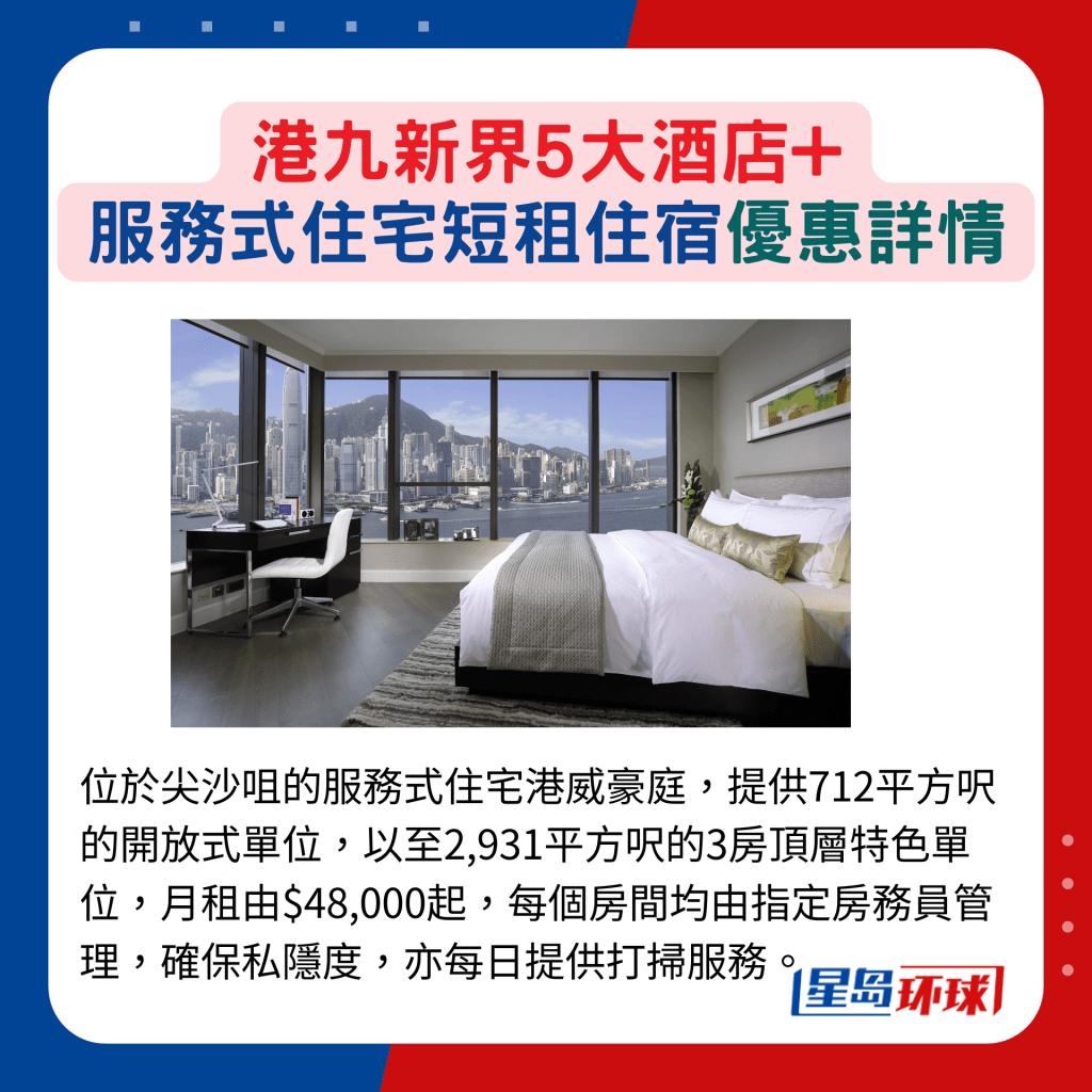 位于尖沙咀的服務(wù)式住宅港威豪庭,提供712平方呎的開放式單位,以至2,931平方呎的3房頂層特色單位,月租由$48,000起,每個(gè)房間均由指定房務(wù)員管理,確保私隱度,亦每日提供打掃服務(wù)。