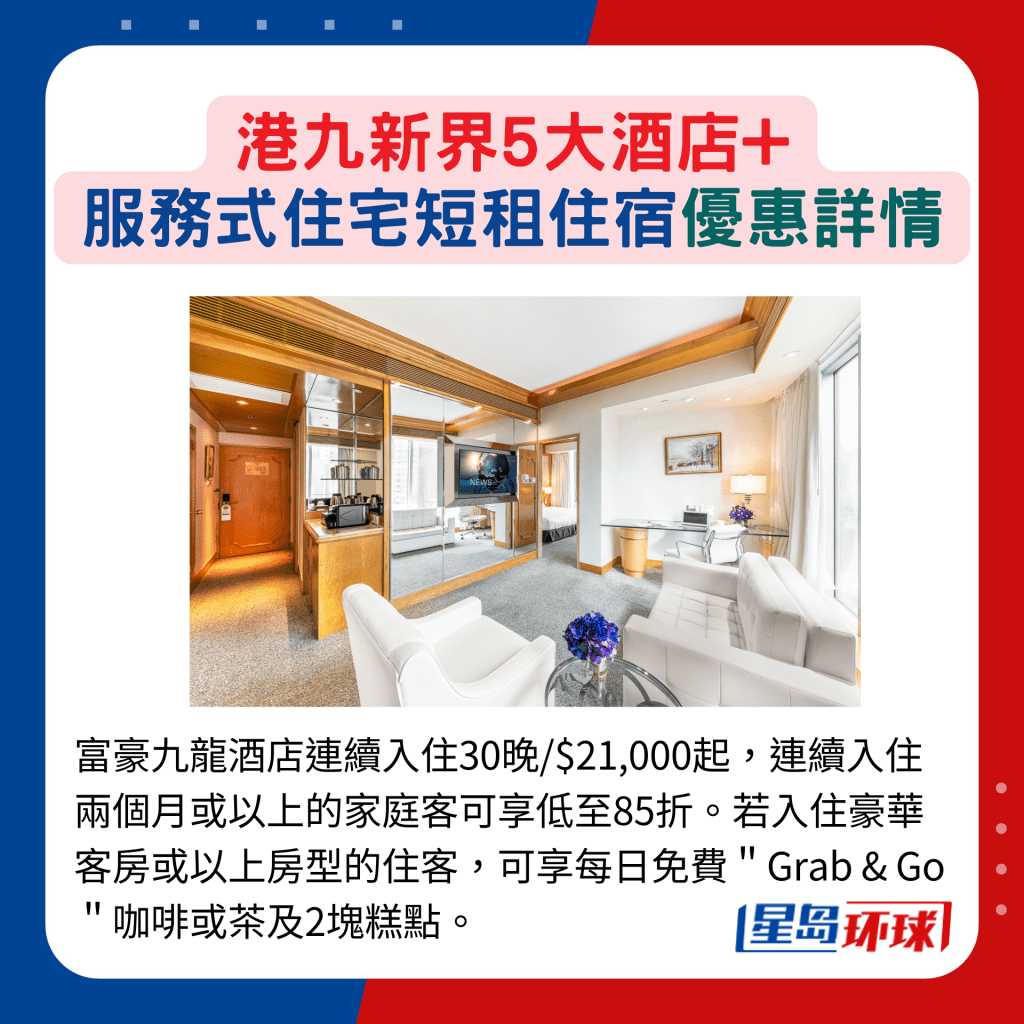 富豪九龍酒店連續(xù)入住30晚$21,000起,連續(xù)入住兩個(gè)月或以上的家庭客可享低至85折。