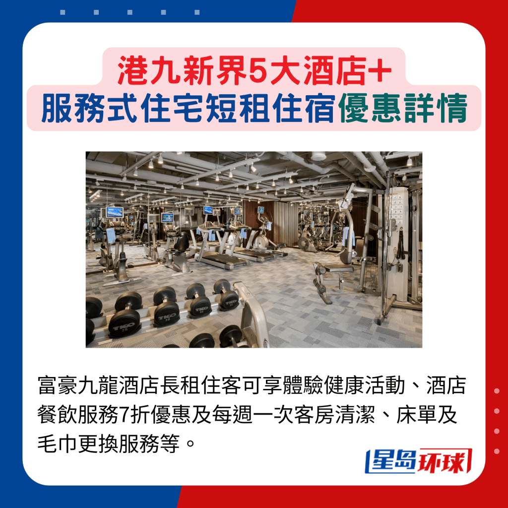 富豪九龍酒店長(zhǎng)租住客可享體驗(yàn)健康活動(dòng)、酒店餐飲服務(wù)7折優(yōu)惠及每周一次客房清潔、床單及毛巾更換服務(wù)等。