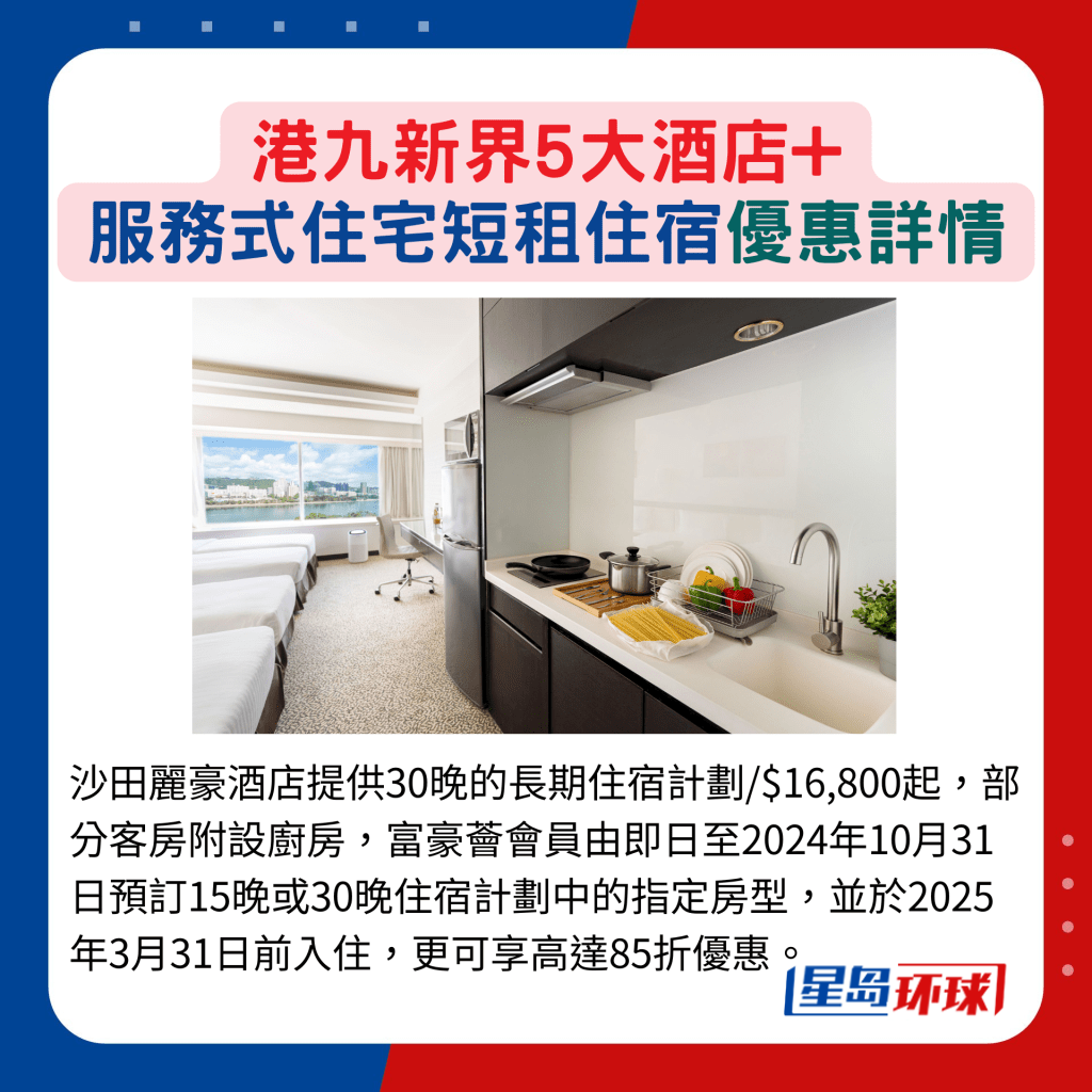 最近完成設(shè)施升級(jí)的荃灣西如心酒店除提供低座房間外, 還包括可作短期租住的全新升級(jí)尊尚全景客房及行政全海景公寓,住客同時(shí)可享全新的Nina Communal多元共享空間,包括煮食區(qū)The Kitchen及設(shè)有電視游戲 的The Den等,享受Me Time, 另可免費(fèi)使用酒店健身中心及泳池。另外,每間客房都配備空氣凈化器,十分貼心。 至于沙田麗豪酒店同樣提供 免費(fèi)共享空間、健身中心及室外游泳池。另提供24小時(shí)自助洗衣及干衣服務(wù),代用幣買一送一。 富豪薈會(huì)員由即日至2024年10月 31日預(yù)訂15晚或30晚住宿計(jì)劃中 的指定房型,并于2025年3月31日 前入住,更可享高達(dá)85折優(yōu)惠。