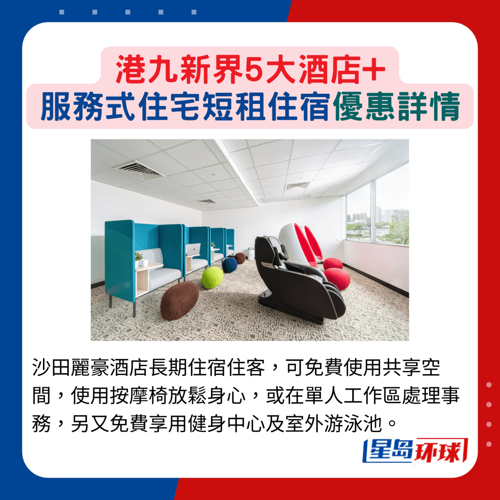 沙田麗豪酒店長(zhǎng)期住宿住客,可免費(fèi)使用共享空間,使用按摩椅放松身心,或在單人工作區(qū)處理事務(wù),另又免費(fèi)享用健身中心及室外游泳池。
