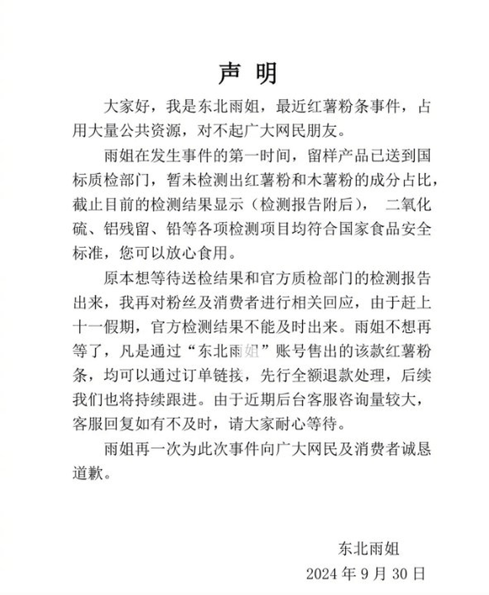 “東北雨姐”之前就紅薯粉事件發(fā)出道歉聲明。