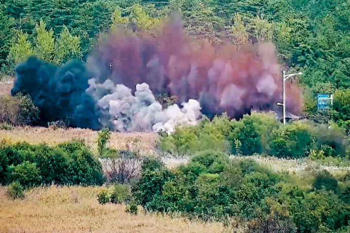 韓國國防部發(fā)布片段可見朝鮮炸毀境內(nèi)連接韓國的道路。.jpg