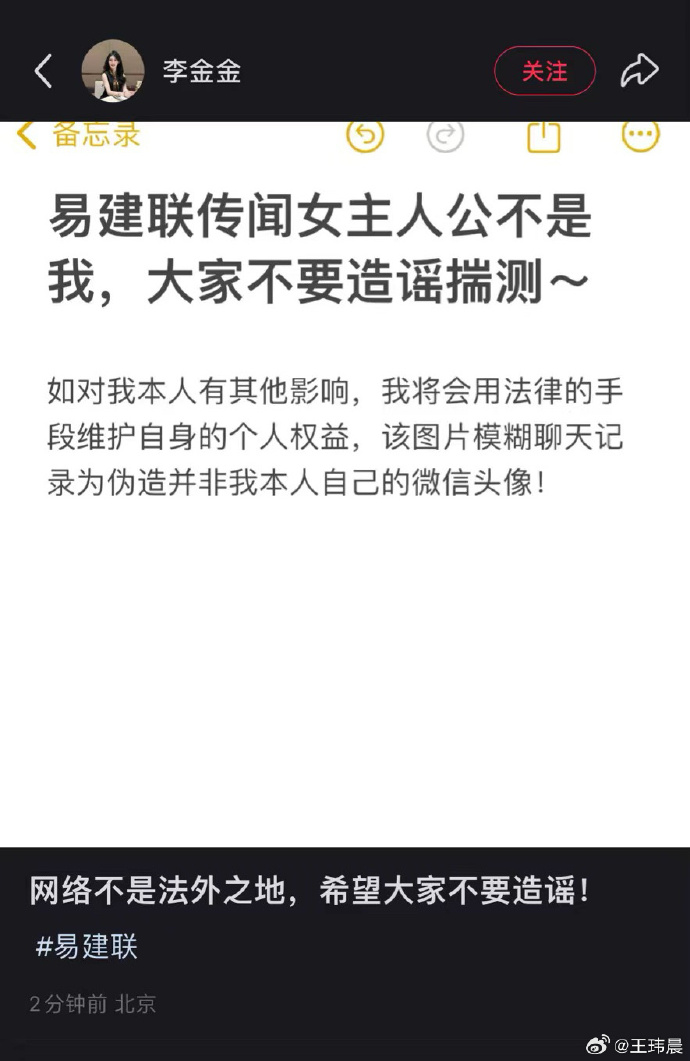 “京城喬姐”李金金在小紅書發(fā)文澄清,聲稱易建聯(lián)傳聞的女主不是他。