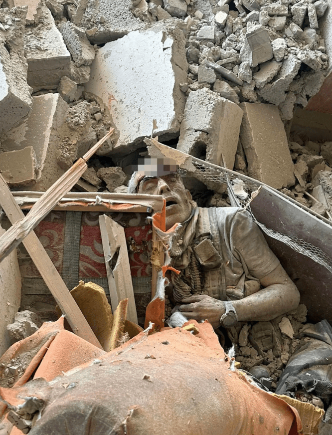 ▲以軍公布的照片顯示,辛瓦爾身穿防彈背心的男子遺體,頭部重創(chuàng),躺在建筑物廢墟中。