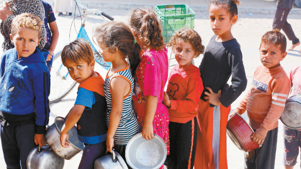 ▲統(tǒng)計顯示,加沙地 帶 1 8 0多萬居民正處于極度危急的饑荒狀態(tài),圖為一群孩子在排隊領(lǐng)食物。 路透社