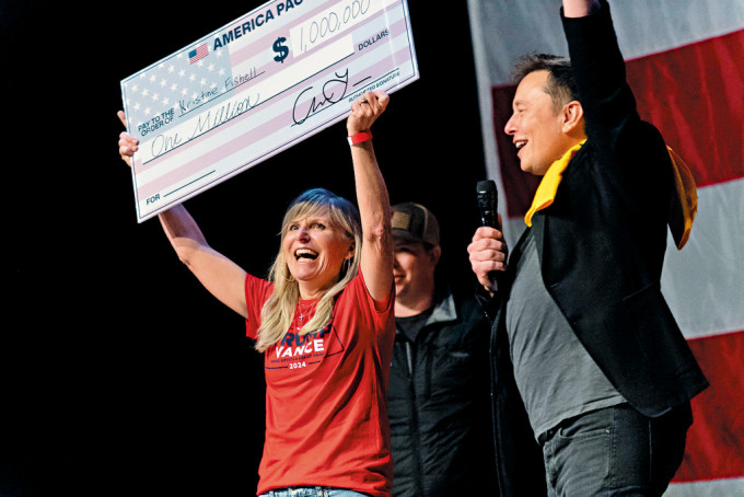 ▲馬斯克周日在匹茲堡把第2張100萬(wàn)美元支票發(fā)給菲舍爾。