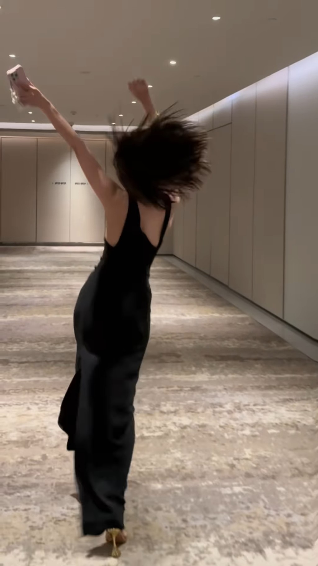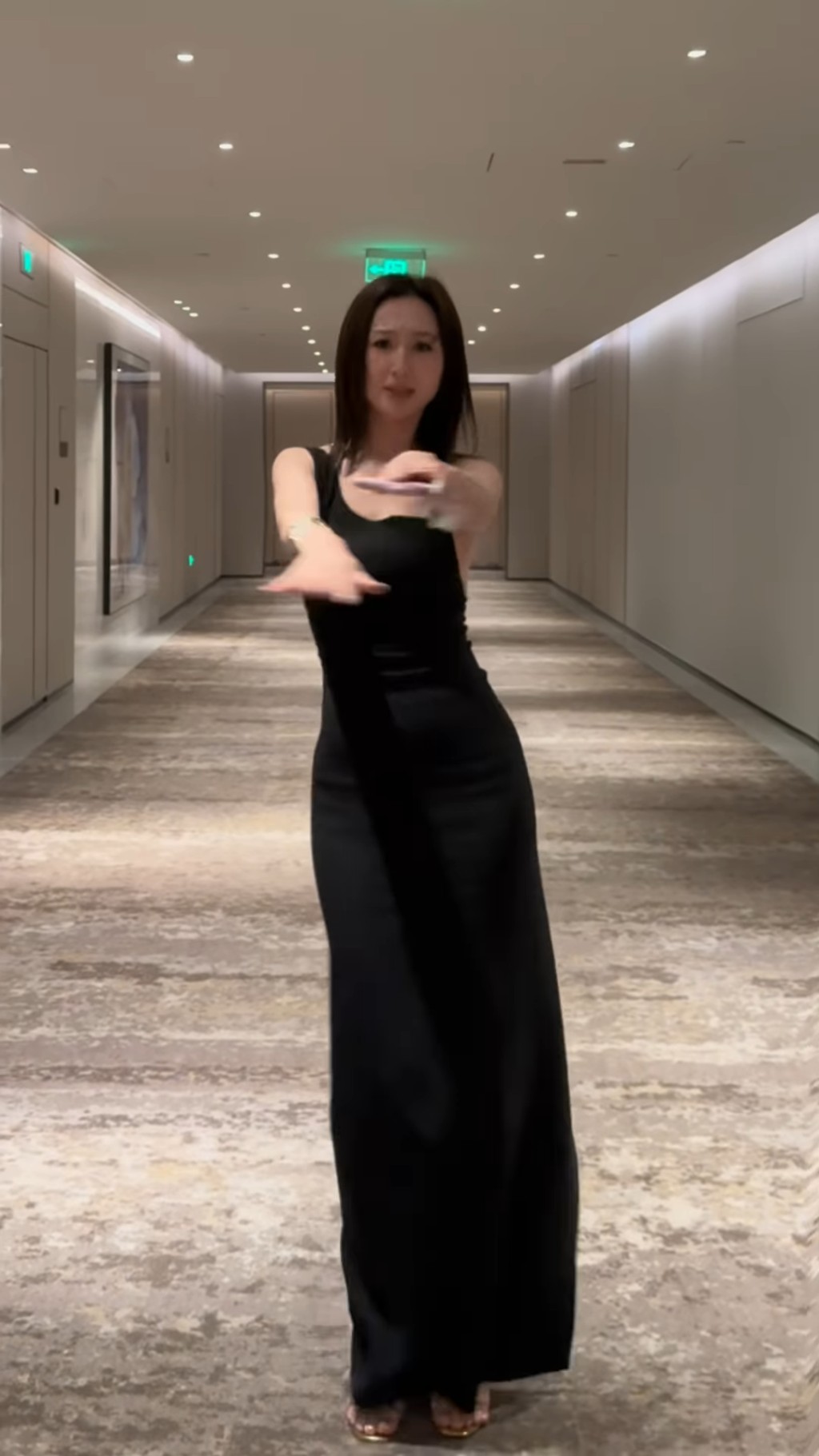 ▲影片中可以看到高海寧穿上一條露背開衩的黑色連身長裙,在酒店走廊隨著工作人員播放近期走紅的洗腦歌《APT.》熱舞。