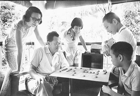 李光耀與童年李顯龍下象棋,妻子柯玉芝及李顯揚(yáng)、李瑋玲在旁觀戰(zhàn)。
