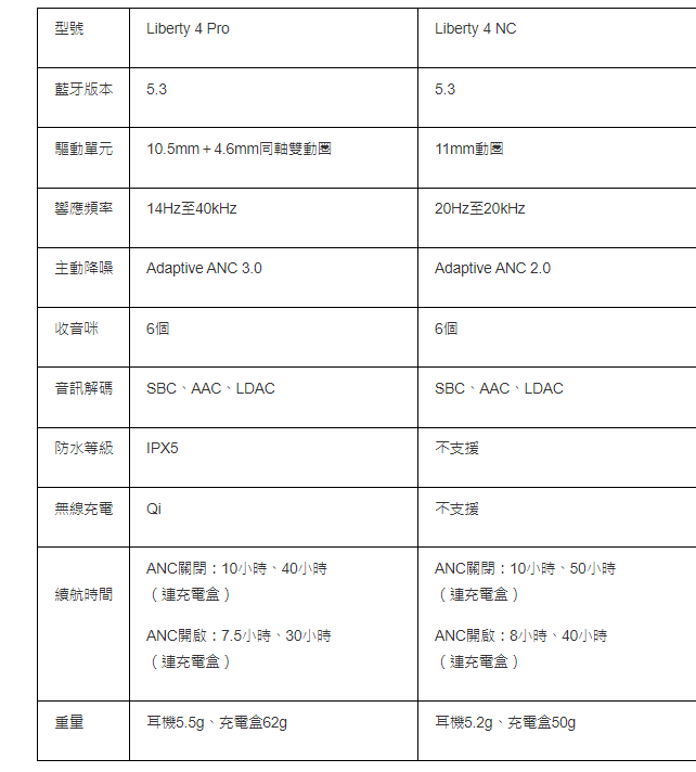 Soundcore Liberty 4 Pro Vs. Liberty 4 NC規(guī)格比較