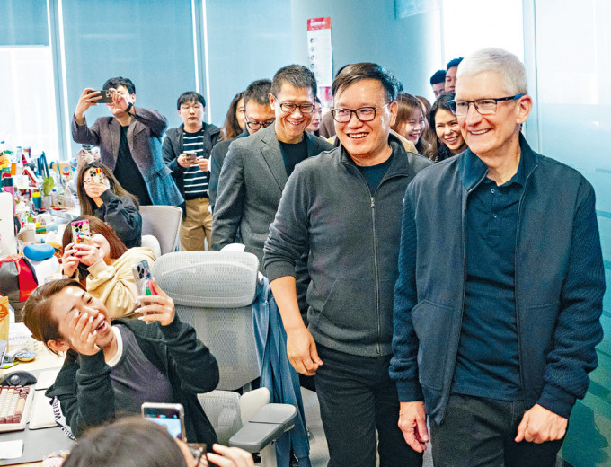 ▲蘋果CEO庫克現(xiàn)身新浪,現(xiàn)場員工紛紛拍照。
