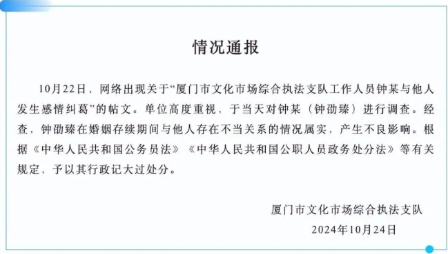 10月22日,網(wǎng)絡(luò)出現(xiàn)關(guān)于“廈門市文化市場綜合執(zhí)法支隊工作人員鐘某與他人發(fā)生感情糾葛”的帖文。單位高度重視,于當(dāng)天對鐘某(鐘劭臻)進行調(diào)查。經(jīng)查,鐘劭臻在婚姻存續(xù)期間與他人存在不當(dāng)關(guān)系的情況屬實,產(chǎn)生不良影響。根據(jù)《中華人民共和國公務(wù)員法》《中華人民共和國公職人員政務(wù)處分法》等有關(guān)規(guī)定,予以其行政記大過處分。