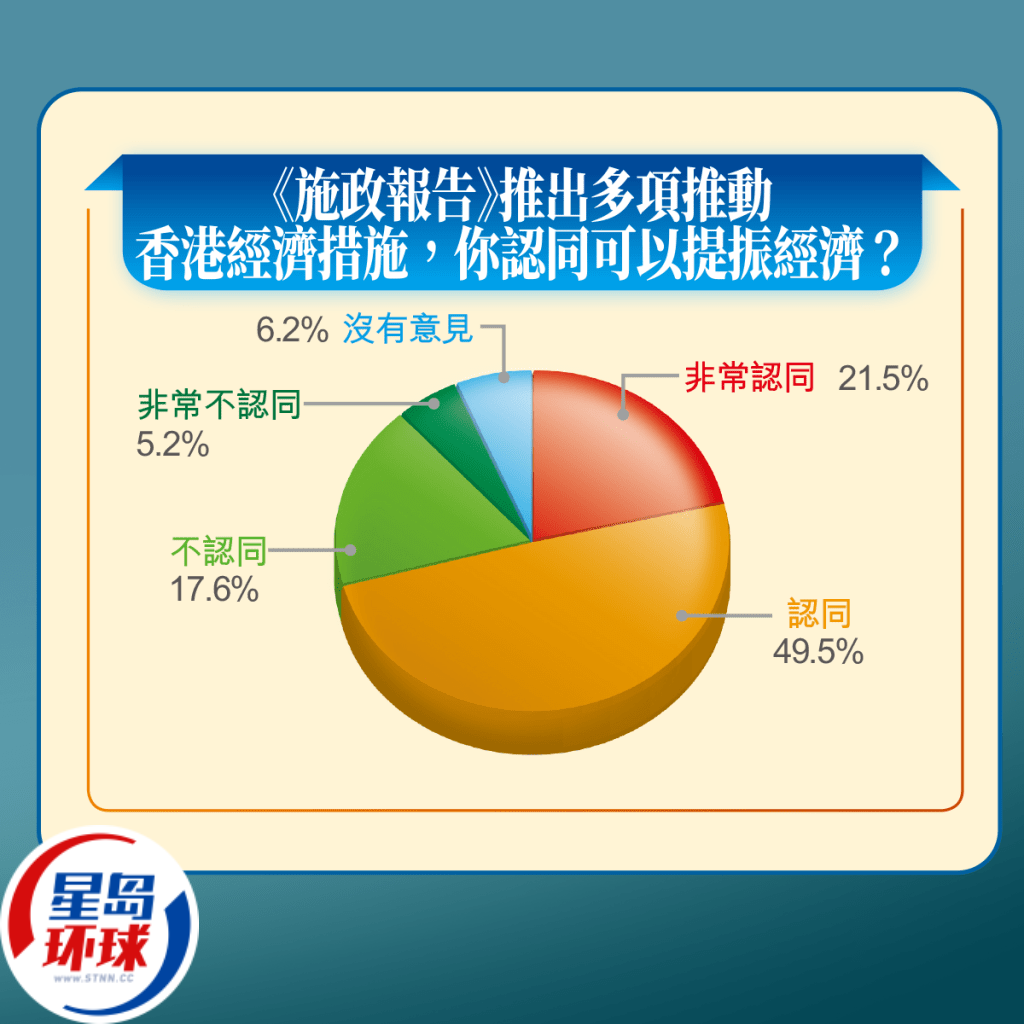 由年初至今,星島新聞集團(tuán)先后進(jìn)行了6次問卷調(diào)查,分別探討市民對“利是公價”、“日夜都繽紛”、“置業(yè)意向”、“特區(qū)政府”及“防騙意識”的意見;而今次共設(shè)有7條問題,包括“《施政報告》推出多項推動香港經(jīng)濟(jì)措施,例如向“BUD專項基金”注資10億元支援中小企、發(fā)展低空經(jīng)濟(jì)等,你認(rèn)同可以提振經(jīng)濟(jì)?”結(jié)果顯示,表示認(rèn)同的接近一半,達(dá)49.5%;表示非常認(rèn)同的有21.5%,即合共71%受訪市民認(rèn)同《施政報告》能提振經(jīng)濟(jì)。表示不認(rèn)同則有17.6%,表示非常不認(rèn)同占5.2%。