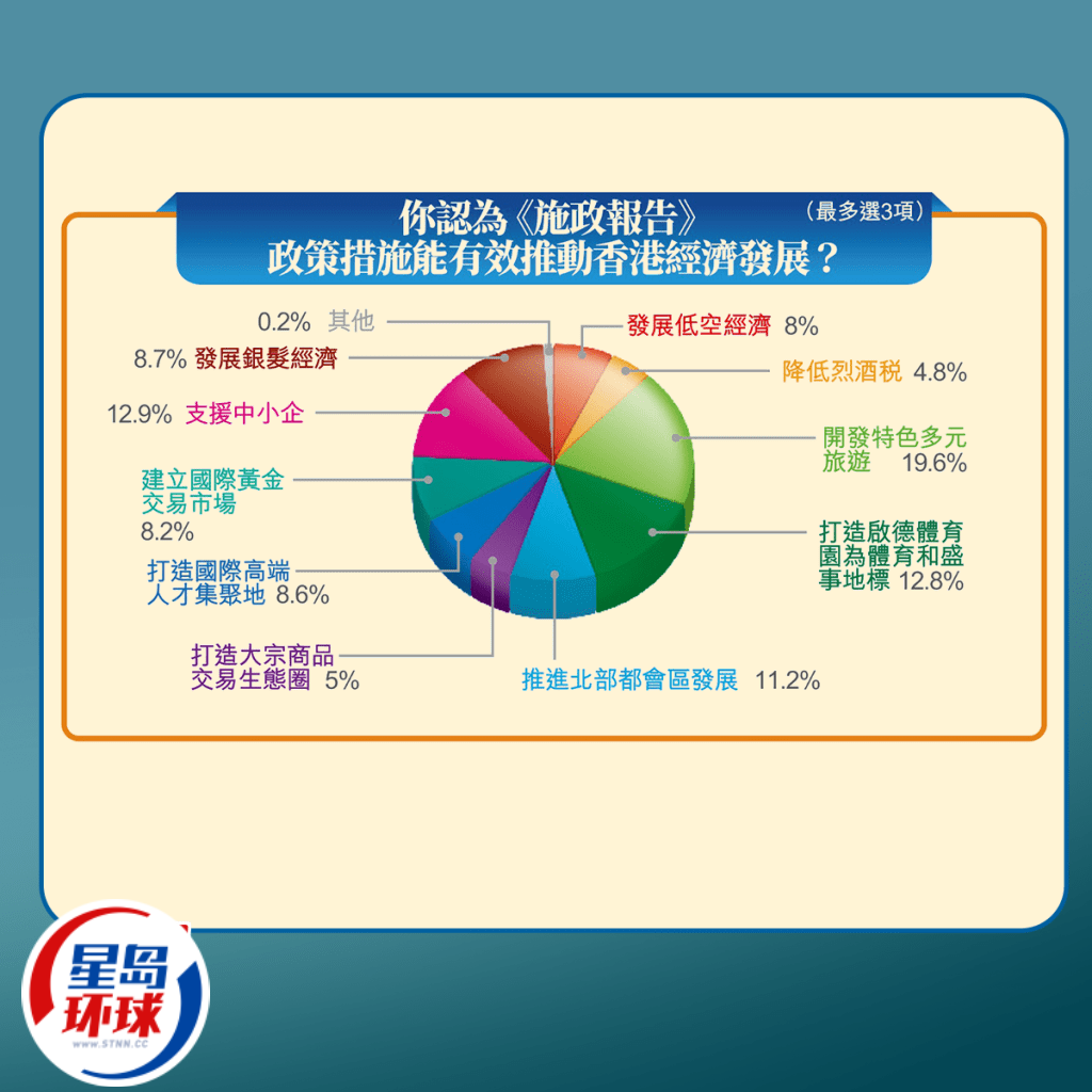 另一條問題是“你認(rèn)為《施政報告》哪些政策措施能有效推動香港經(jīng)濟(jì)發(fā)展?”(最多可選3項)。結(jié)果顯示,最多受訪市民認(rèn)為是開發(fā)特色多元旅游,占19.6%;緊隨其后是支援中小企,占12.9%,以及打造啟德體育園為體育和盛事地標(biāo),占12.8%;推進(jìn)北部都會區(qū)發(fā)展、發(fā)展低空經(jīng)濟(jì),則分別占11.2%及8%。