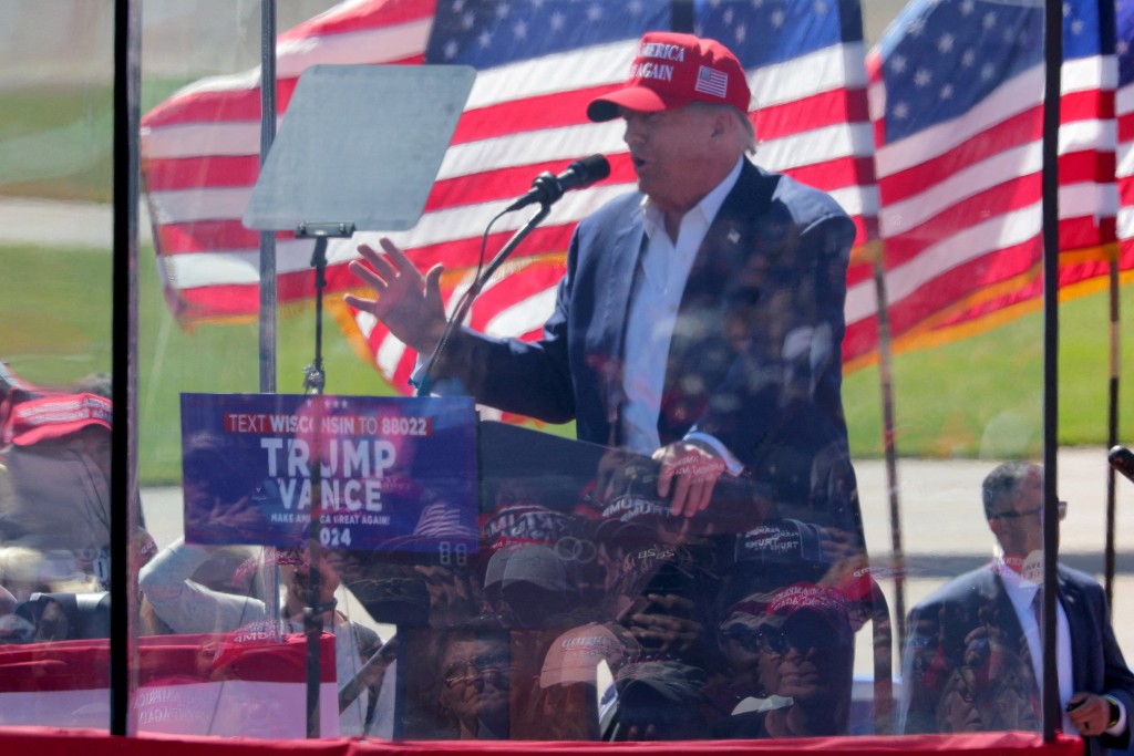 ▲特朗普在關(guān)鍵搖擺州威斯康辛州造勢(shì)大打經(jīng)濟(jì)牌。路透社