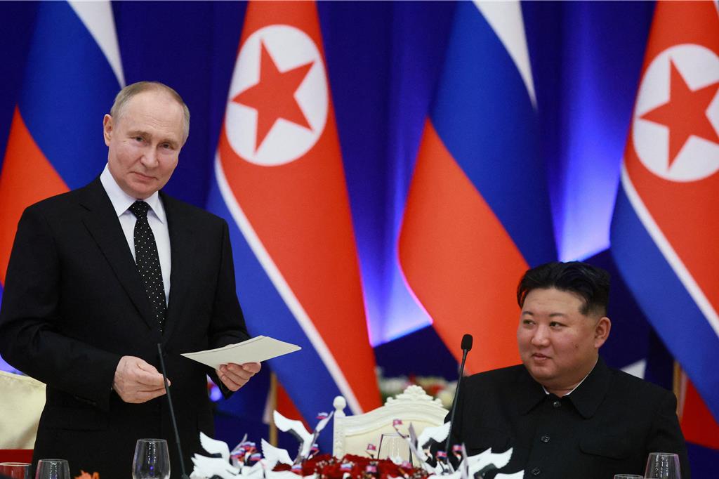 ▲俄羅斯總統(tǒng)普京(左)今年6月造訪朝鮮會(huì)見(jiàn)朝鮮最高領(lǐng)導(dǎo)人金正恩(右)。 路透社