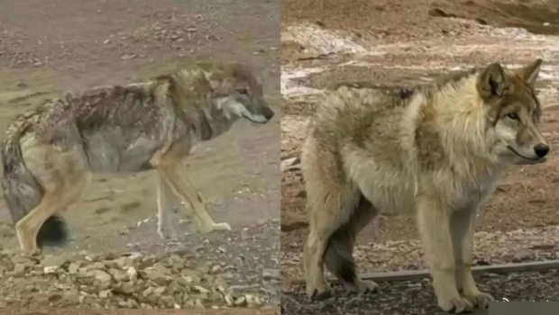 ▲原本瘦骨嶙峋的野狼,在人類不斷投喂后變成肥狼。影片截圖