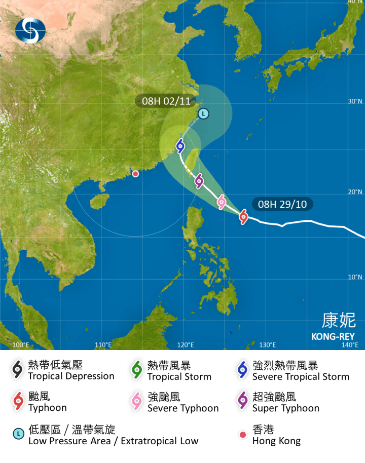 ▲天文臺(tái)預(yù)料臺(tái)風(fēng)康妮10月31日升格超強(qiáng)臺(tái)風(fēng),并橫過臺(tái)灣南部。天文臺(tái)圖片