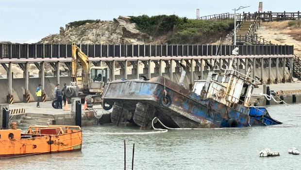 現(xiàn)場(chǎng)工作人員表示,這艘用來進(jìn)行海上浚深工程的工作平臺(tái),原在日前就因船體有些微滲水,已先拖回復(fù)國(guó)墩漁港待檢修,沒想在臺(tái)風(fēng)外圍環(huán)流所帶來的強(qiáng)風(fēng)巨浪襲擊下,船體又撞擊到岸邊導(dǎo)致滲水情況更為嚴(yán)重,才使的船首沉入水中,但應(yīng)無沉船之虞,目前先找來怪手綁繩牽引加強(qiáng)防撞措施,待臺(tái)風(fēng)過后再由大型機(jī)具與拖船進(jìn)行復(fù)原工作;也提醒民眾切勿靠近,以免發(fā)生危險(xiǎn)。