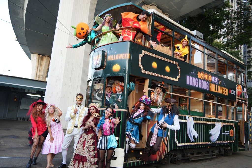 旅發(fā)局今晚在港島舉行派對(duì)電車巡游表演,晚上6時(shí)至10時(shí)期間“哈羅威香港”派對(duì)電車會(huì)往返西環(huán)屈地街及銅鑼灣,電車上有南瓜、鬼怪等各種萬圣節(jié)圖案,一眾穿上萬圣節(jié)應(yīng)節(jié)裝扮的演藝人員登上派對(duì)“叮?!毖赝靖忻褚娒婊?dòng)。