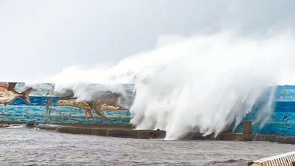 ▲康妮臺(tái)風(fēng)挾狂風(fēng)暴雨登陸臺(tái)東縣成功鎮(zhèn),臺(tái)東市富岡漁港掀10米巨浪越過堤防。中時(shí)