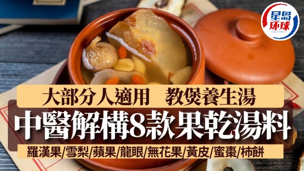 羅漢果、雪梨干、蘋(píng)果干、龍眼干、無(wú)花果、黃皮干、蜜棗及杮餅,都是常見(jiàn)干果湯料。注冊(cè)中醫(yī)林冠杰醫(yī)師指,踏入秋天不宜大量進(jìn)補(bǔ),他建議用這8款適合大部分人體質(zhì)的果干做湯料,煲煮具滋潤(rùn)補(bǔ)肺、養(yǎng)心健脾等功效的保健湯水。今日由林醫(yī)師講解這些果干的功效及宜忌,并有裕生海味負(fù)責(zé)人黃祺分享挑選及處理果干的小秘訣,讓大家懂得自煮時(shí)令湯水。