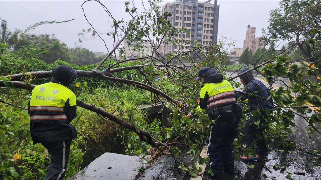 龍?zhí)毒志指咂脚沙鏊瘑T卓光煜、葉云翔巡邏前往高楊北路處理招牌掉落,現(xiàn)場(chǎng)舊招牌被強(qiáng)風(fēng)吹得搖搖欲墜,立即聯(lián)系屋主將招牌卸下。三和派出所副所長(zhǎng)陳佶汎、警員唐銘聰巡邏前往龍新路三和段處理路樹(shù)橫倒路中間。龍?zhí)杜沙鏊策墕T警李芳吉、方瑞麟,前往中豐路上林段處理電線斷裂起火案件。圣亭派出所巡佐陳秉贏、警員曾建凱、黃偲偊處理梅龍路285巷口路樹(shù)倒塌占用單向車道。