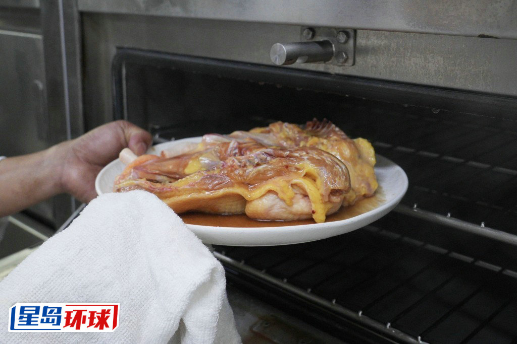 將鮮雞洗凈及瀝干,切開雞背,加入腌料腌12小時(shí)。