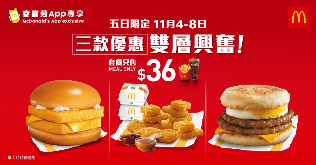 ▲麥當(dāng)勞優(yōu)惠︳三款$36超值套餐強(qiáng)勢(shì)回歸! 快閃五日 雙層魚柳飽/雙層豬柳蛋漢堡/12件麥樂(lè)雞 內(nèi)文附優(yōu)惠詳情