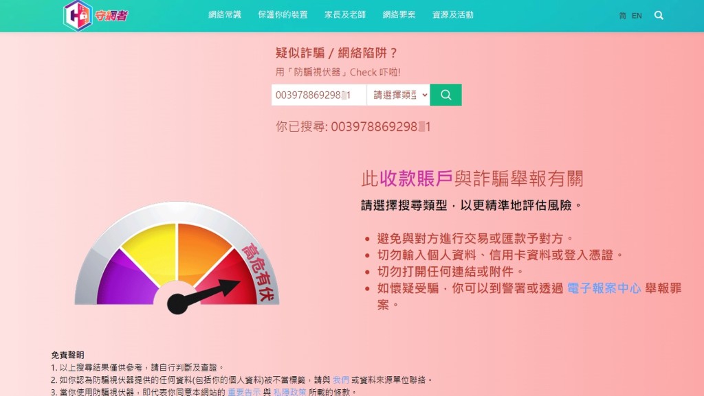 警方“守網(wǎng)者”網(wǎng)頁的“防騙視伏器”( https://cyberdefender.hk/ )可輸入相關(guān)資料查閱是否曾涉及詐騙的舉報(bào),記者于是輸入苦主提供的兩個(gè)收款賬號(hào),結(jié)果均顯示“高危有伏”,但輸入“蟹X”騙徒提供給記者的賬號(hào)則顯示“未有紀(jì)錄”,相信是使用不久的傀儡戶口。
