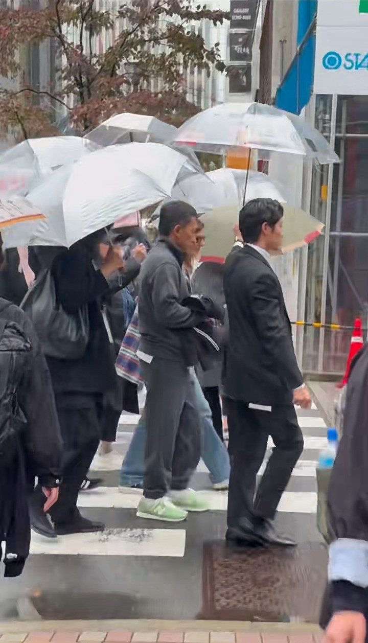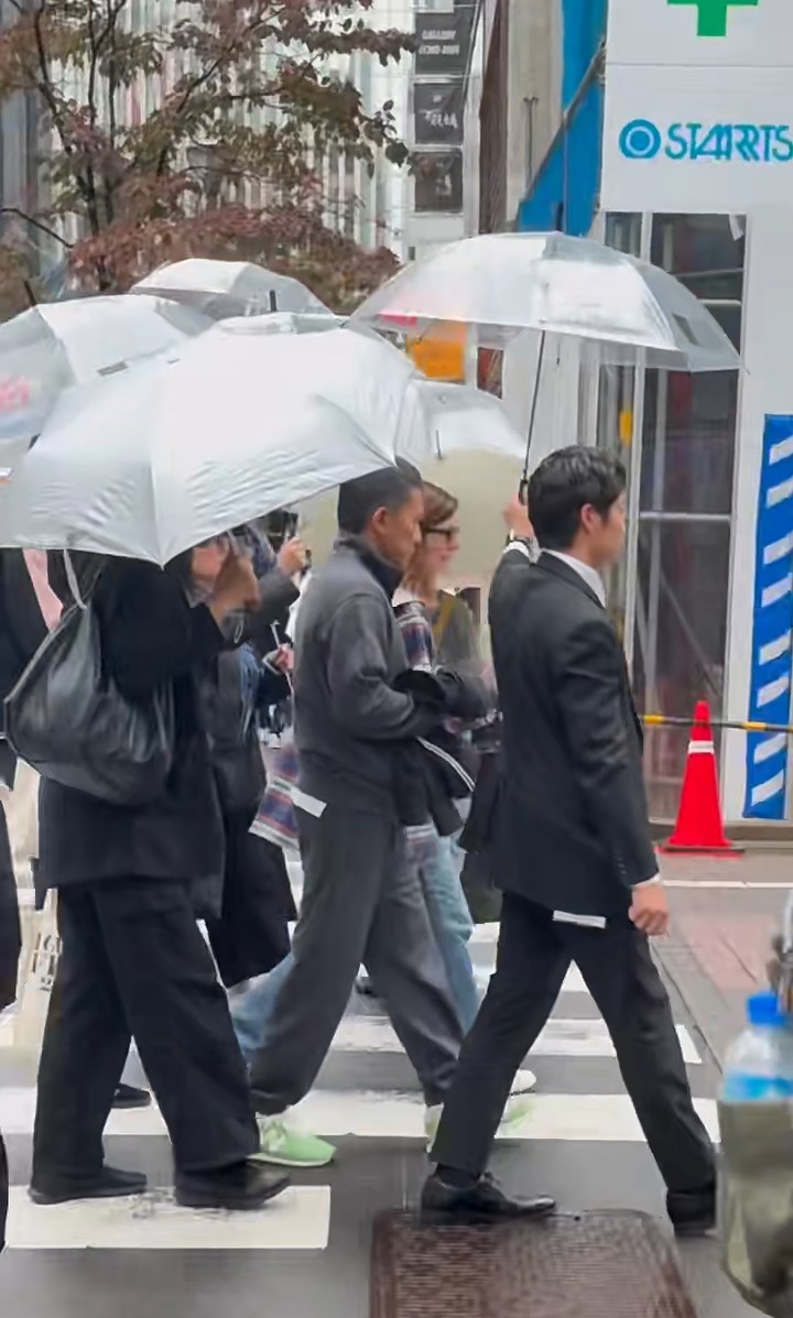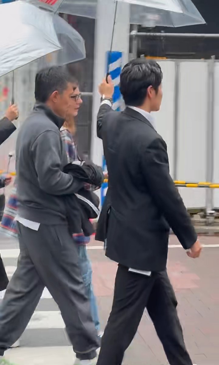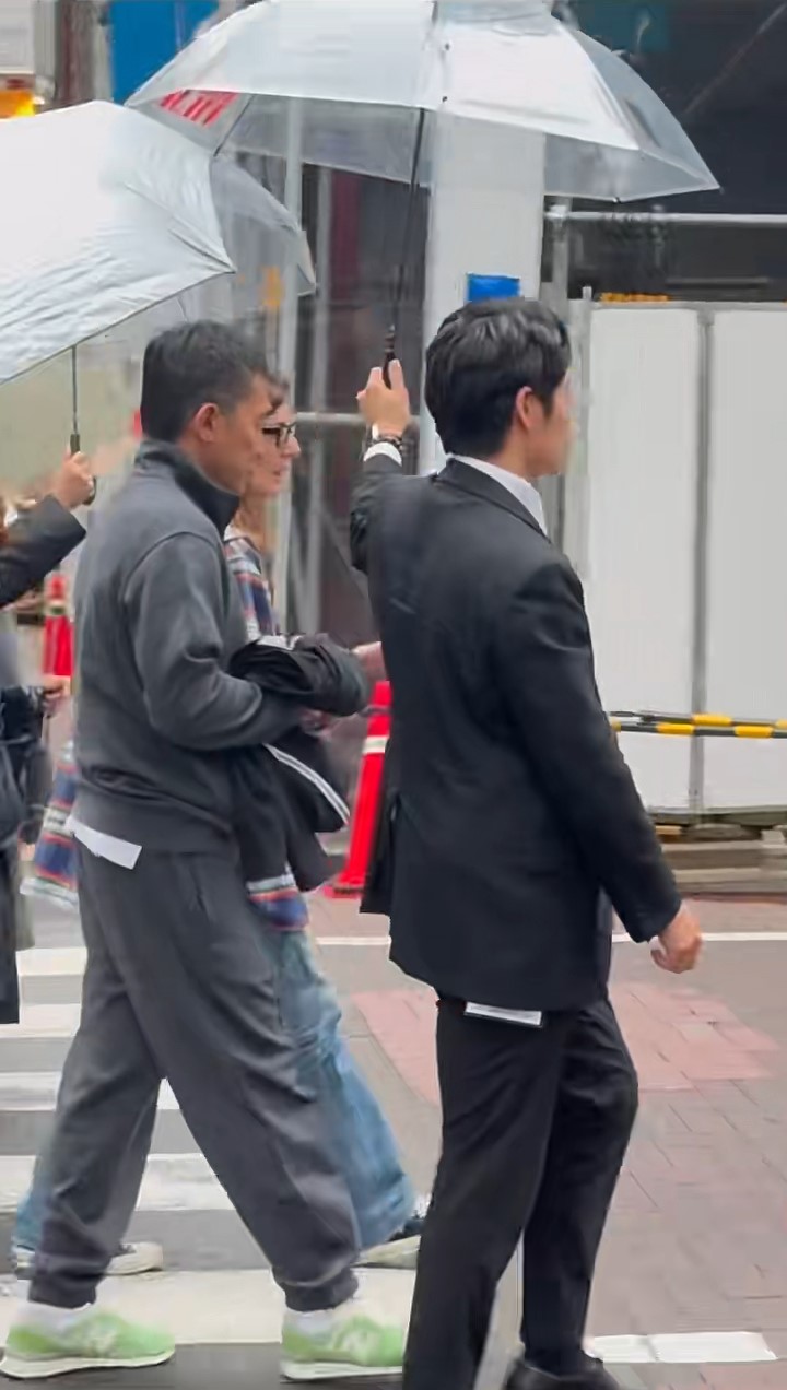 影片可見,梁朝偉一身灰色運(yùn)動(dòng)裝束,手揸一件黑色外套在銀座現(xiàn)身,他一行多人越過斑馬線慢步行。 當(dāng)時(shí)天氣不穩(wěn),下著毛毛細(xì)雨,梁朝偉前面有一個(gè)穿黑色西裝疑似是保安的男士為他打傘,梁朝偉身旁及身后都有多名穿黑衣的工作人員同樣為他打傘,而梁朝偉則忙于跟身旁的外藉女子說話,如此大排場(chǎng),絕對(duì)招徠途人目光。