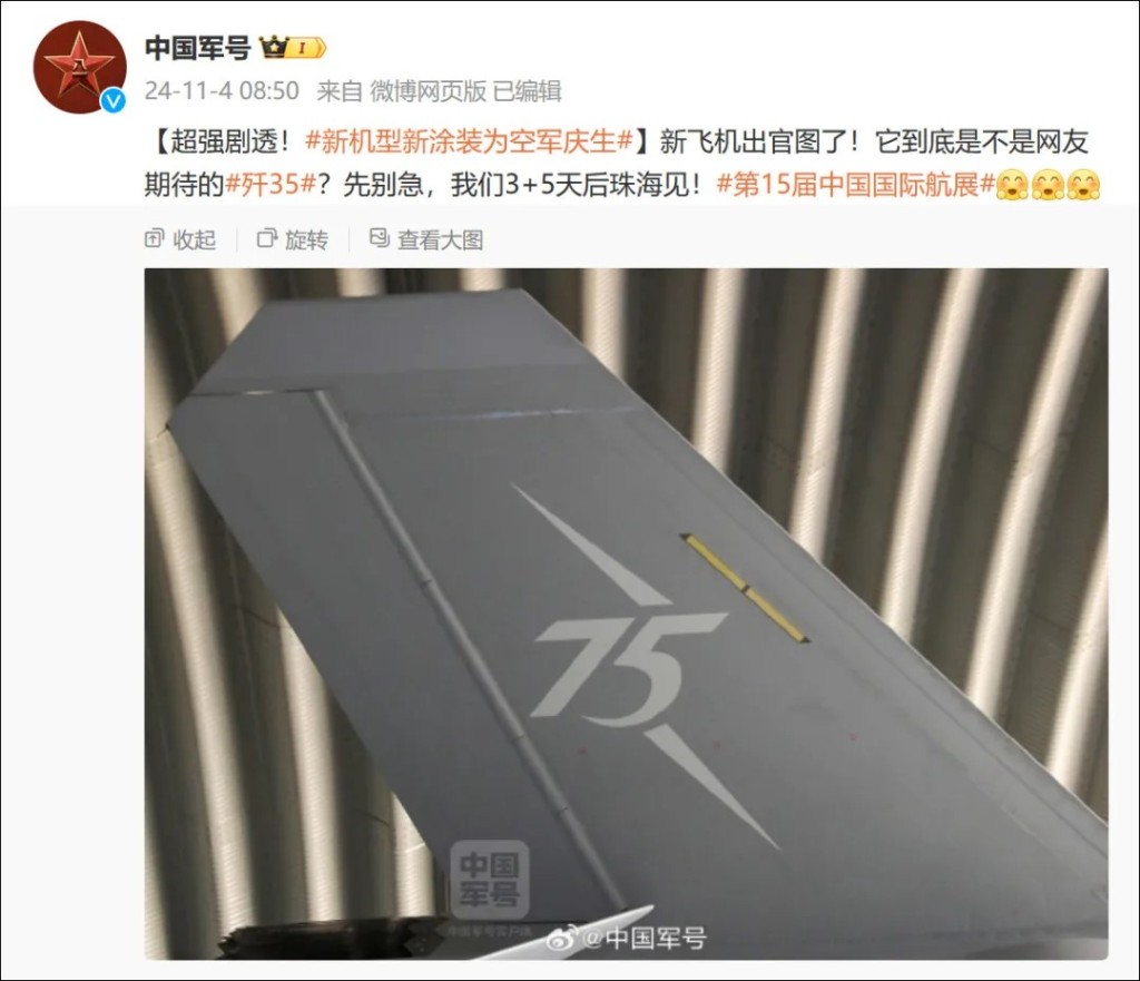 11月4日上午,中國軍方官方微博“中國軍號”發(fā)布的一則消息引發(fā)網(wǎng)友熱議。文案中寫道:“新飛機出官圖了!它到底是不是網(wǎng)友期待的殲35?先別急,我們3+5天后珠海見!”
