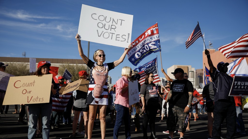 2020年美國大選結束后,特朗普支持者在亞利桑那州鳳凰城馬里科帕縣選舉中心外抗議選舉早期結果。