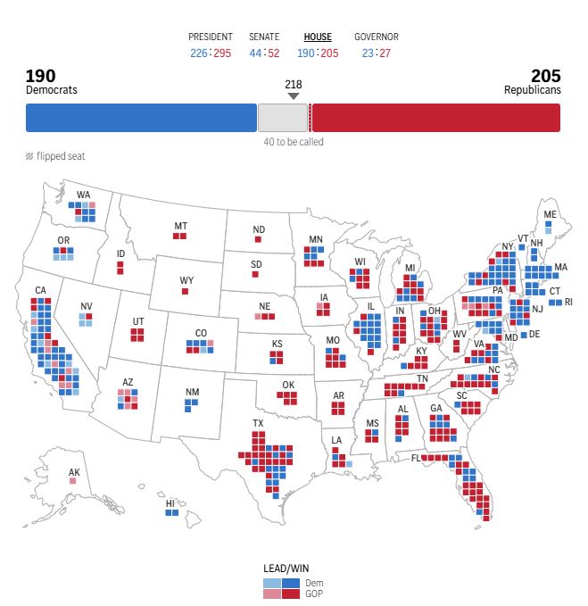 據(jù)美聯(lián)社的統(tǒng)計,至今日清晨,共和黨已取得眾議院205席,民主黨取得190席,要獲得控制權(quán)需取得過半數(shù)的218席(眾議院共有435個議席)。