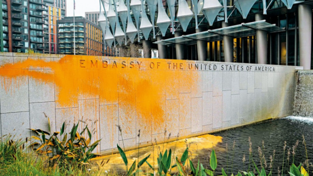英國環(huán)保人士周三向美國駐倫敦大使館建筑物墻壁,噴灑橙色油漆,抗議美國共和黨候選人特朗普在總統(tǒng)大選中勝出,倫敦警方逮捕了兩名涉嫌刑事毀壞的男子,年齡分別25歲和72歲。環(huán)保團(tuán)體“停止石油”(Just Stop Oil)在社交平臺X上傳的影片,可見2人在美國大使館入口的墻上噴橙色漆?!巴V故汀敝赋觯骸疤乩势談龠x,讓平民百姓的性命處于險境,對每個地方而言都是如此?!边@個環(huán)保團(tuán)體曾在英國發(fā)起多場高調(diào)的抗議活動,包括向梵高的畫作潑灑湯汁。