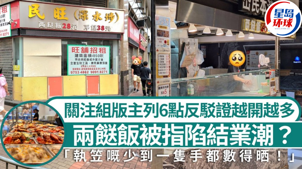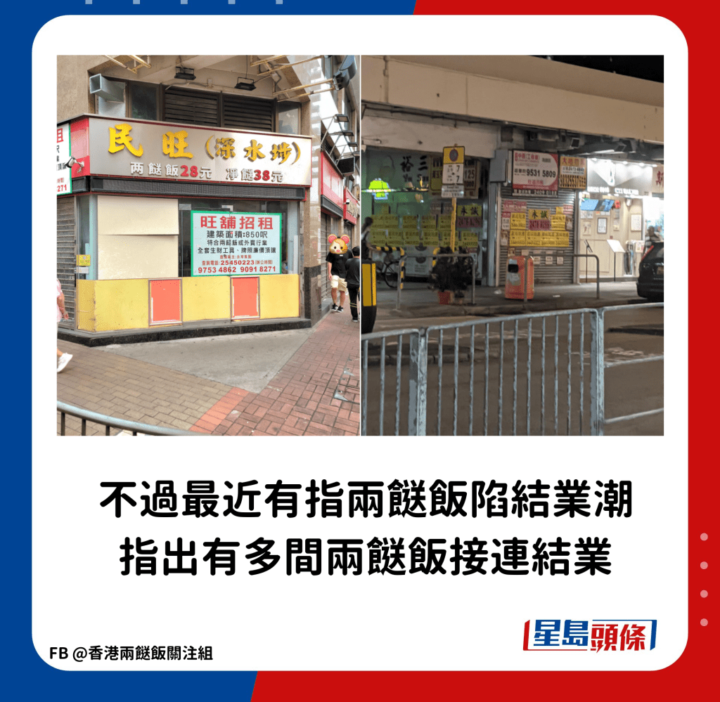 近日有報(bào)導(dǎo)指出,多區(qū)都有兩餸飯店接連結(jié)業(yè),包括位于元朗的“裕三和”、位于深水埗的“民旺”、“岱民”小西灣分店以及佐敦的“家之味”,形容連“窮人恩物”都不敵結(jié)業(yè)潮,引起網(wǎng)民熱議,有人表示“做唔住都係因?yàn)檫砗檬场!?、“收支不平衡早早結(jié)業(yè)”、“開始食到厭”、“斗平無用,要好食先得?!备齺鞦acebook群組“香港兩餸飯關(guān)注組”版主亦發(fā)文回應(yīng)!