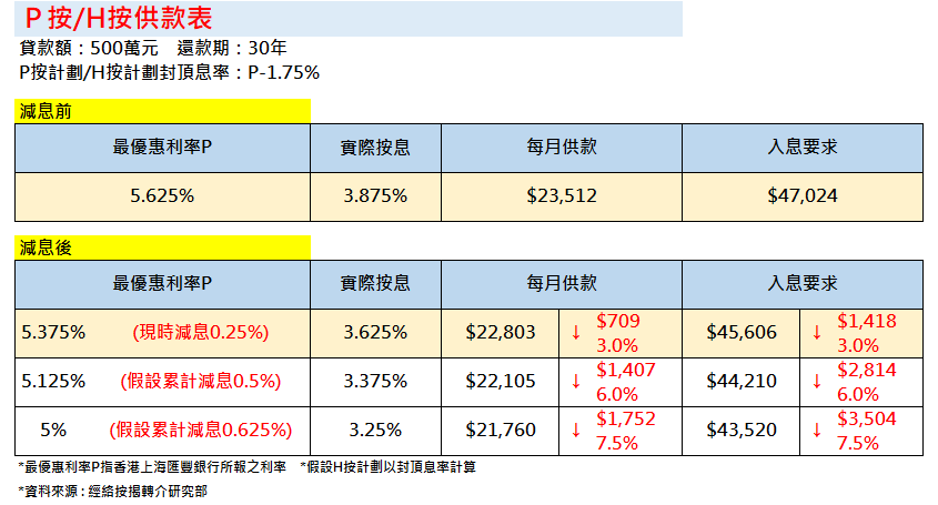 假設(shè)貸款額500萬元、年期為30年,減息前P按計劃及H按封頂利率為P-1.75%=3.875厘(P=5.625%),每月供款為$23,512,入息要求為$47,024;當(dāng)銀行下調(diào)最優(yōu)惠利率(P)0.25厘,實際按息將下調(diào)至3.625厘(5.375%-1.75%),每月供款將減少$709(3%)至$22,803,入息要求將減少$1,418(3%)至$45,606,假設(shè)未來銀行再度下調(diào)最優(yōu)惠利率(P),每月供款及入息要求亦將會繼續(xù)下降。