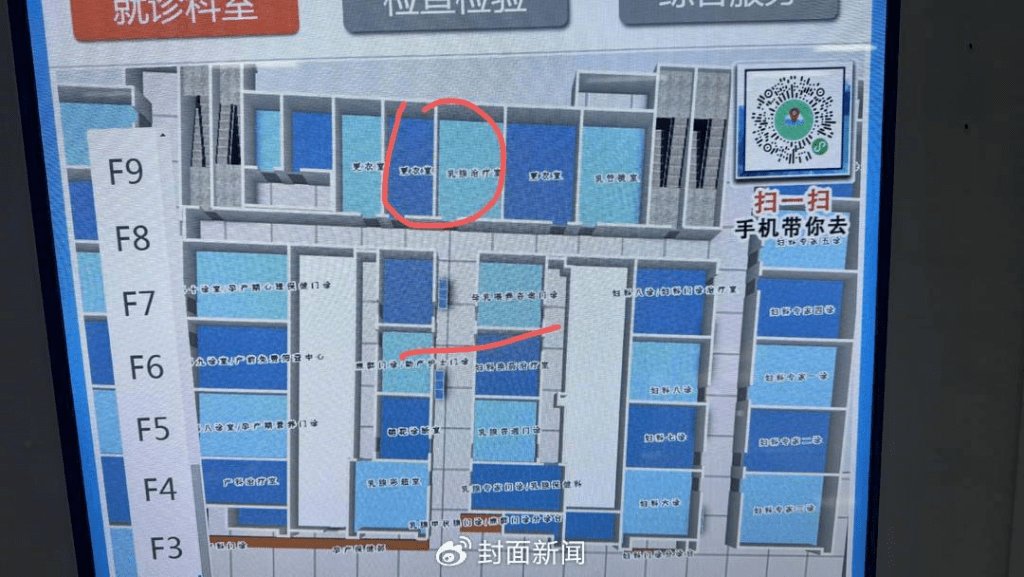 據(jù)封面新聞,博主向記者出具的醫(yī)院平面圖顯示,被偷拍房間位于醫(yī)院二樓乳腺門診層,為乳腺治療室旁的一處更衣室。