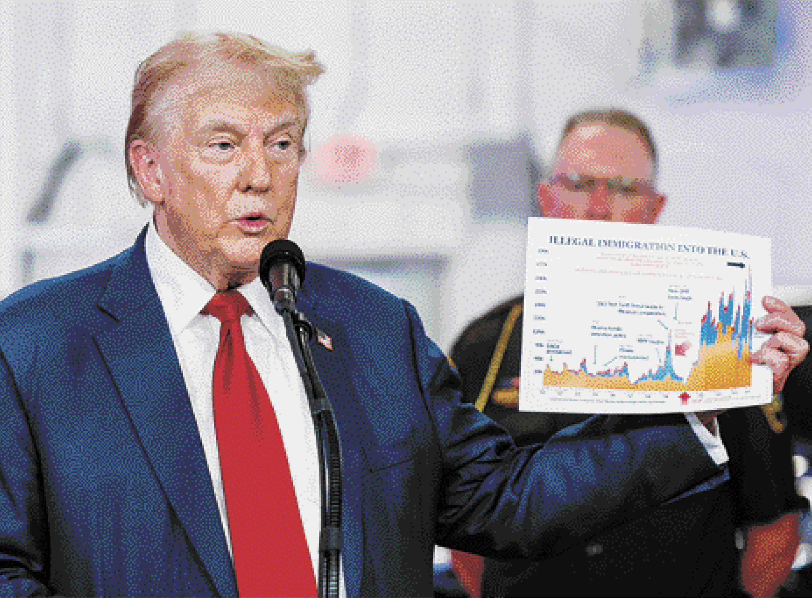 ▲候任總統(tǒng)特朗普宣稱明年接任后的首要任務(wù)之一就是解決非法移民問題。圖為他訪問密歇根州豪厄爾市利文斯頓縣治安官辦公室時,手拿一張有關(guān)非法移民美國的圖表。 路透社資料圖片