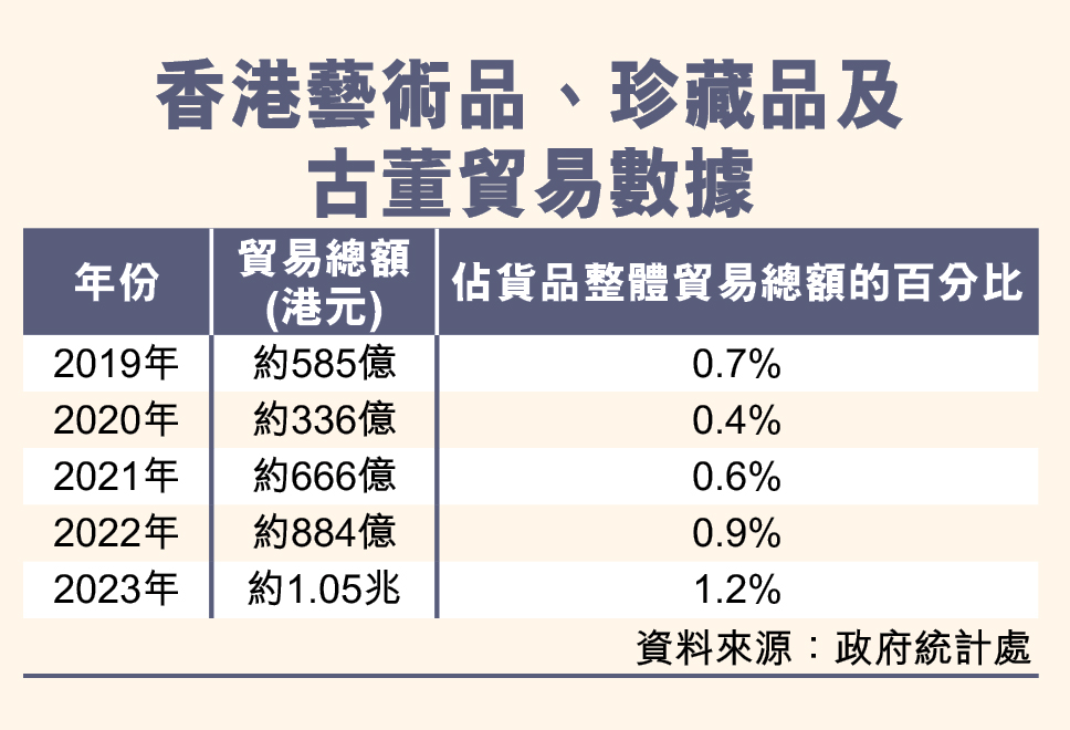 香港藝術(shù)品交易市場一直蓬勃發(fā)展,參考政府統(tǒng)計處數(shù)據(jù),過去5年,香港藝術(shù)品、珍藏品及古董每年貿(mào)易總額,介乎約336億至1.055兆港元不等,成績驕人(見表)。