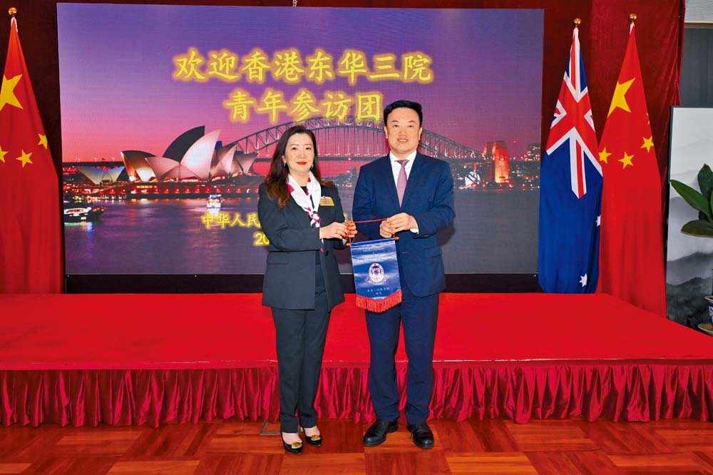 參訪團(tuán)拜訪中國駐悉尼總領(lǐng)事館,鄧明慧主席(左)更獲中國駐悉尼總領(lǐng)事館代總領(lǐng)事于杰先生(右)接見。