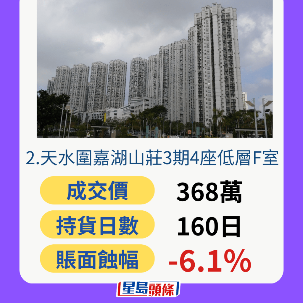 至于2024年買入轉(zhuǎn)手賺幅最高的為觀塘寶恩大廈中層A室,2024年3月410萬元買入,8月480萬元售出,賬面賺幅17.1%。而賬面蝕幅最高為太子東海大廈低層18室,2024年1月380萬元買入,7月340萬元售出,賬面蝕幅10.5%。上述2個個案均為500萬元以下的低價單位。