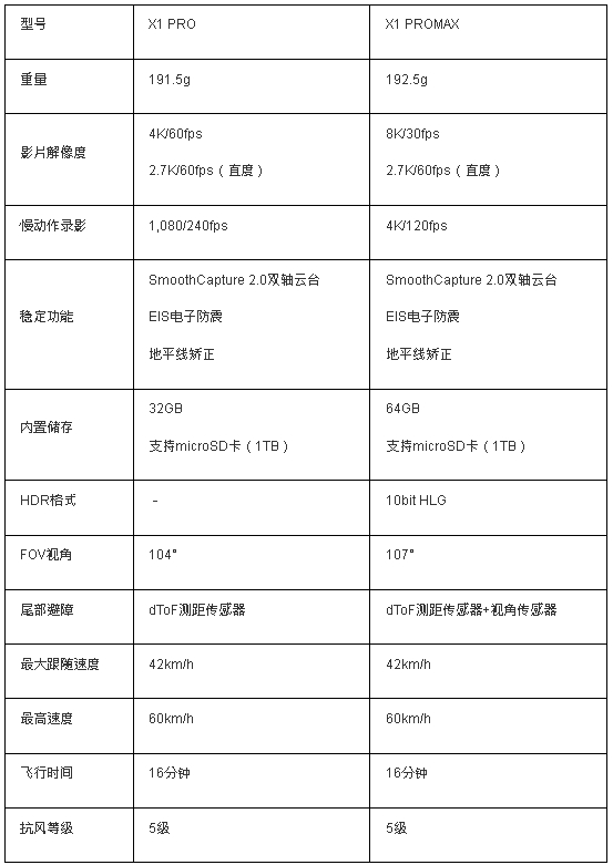 HOVERAir X1 PRO及X1 PROMAX規(guī)格