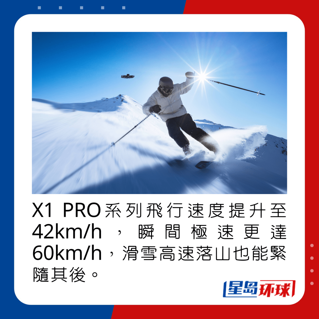 X1系列不錯頗受單車友歡迎,不過由于飛行速度最快僅24km/h,單車友踩得太快有時候會跟不上。 有見及此,X1 PRO系列飛行時提速至42km/h,瞬間最高速度可達(dá)60km/h,公路踩單車也好,滑雪也好,2款新作都可高速跟隨用家,確保捕捉到精彩時刻。 飛得快之余,X1 PRO系列亦飛得更穩(wěn)更高,抗風(fēng)能力由4級提升至5級,飛行高度大幅攀升至120米,續(xù)航時間亦由11.5分鐘延長至16分鐘,配合便攜式智能充電盒,續(xù)航可延長至56分鐘。