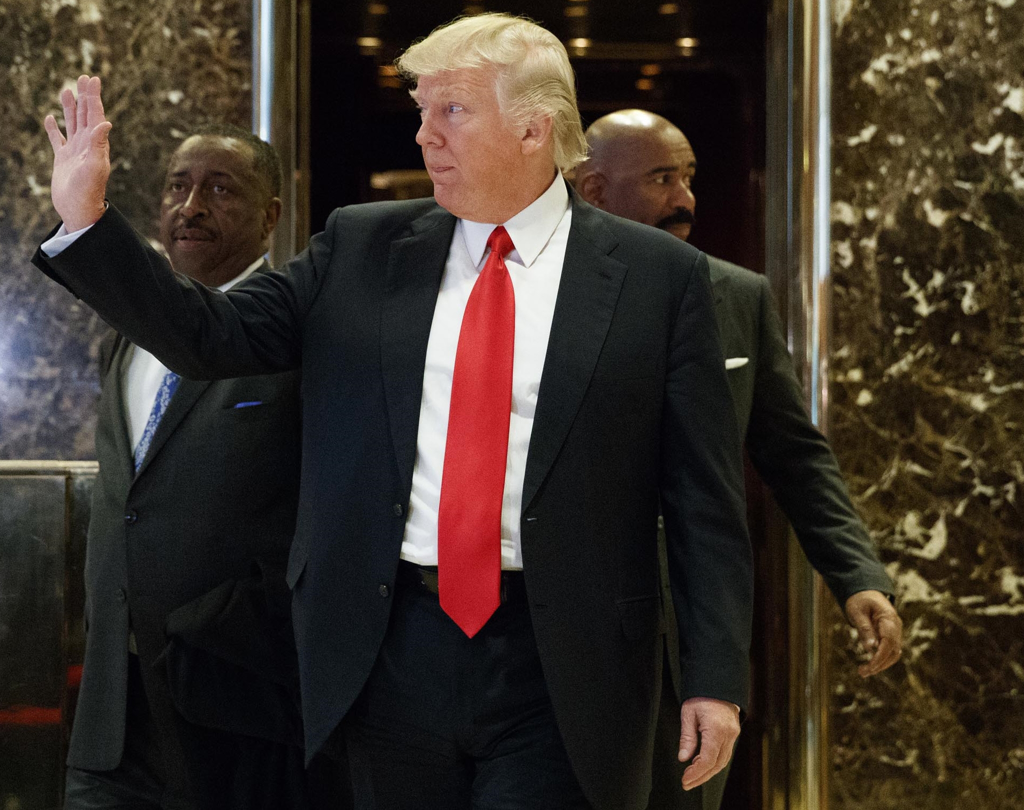 美國準(zhǔn)總統(tǒng)特朗普迅速公布內(nèi)閣名單,圖為他步出紐約特朗普大樓金碧輝煌的電梯,向在場人士揮手的資料照。